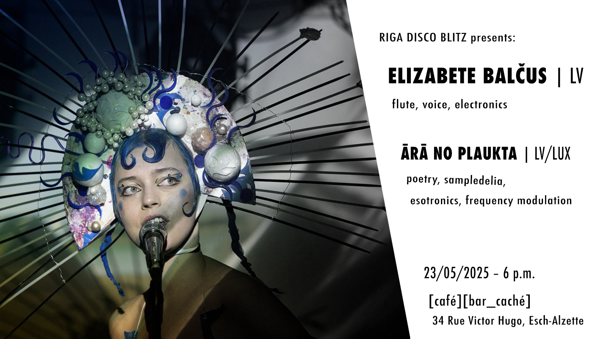 ELIZABETE BALČUS is a Latvian musician and performance artist who creates neo-psychedelic dream pop through surprising juxtapositions of genres, blending collage, melody, and experimentation. She develops a strong visual aesthetic inspired by modern surrealism, contemporary fashion, and geometric imagery. In her musical universe, everything is permitted: loops of flute and vocals, clicking electro-pop rhythms, and even vegetables played as synthesizers. Her live performances plunge the audience into a psychedelic and theatrical experience, both disconcerting and captivating. Apart from her numerous musical collaborations, she has released two critically acclaimed albums – ‘Hotel Universe’ and ‘Conarium’. Both releases were accompanied by extensive touring across Europe, Canada, Japan and Taiwan.