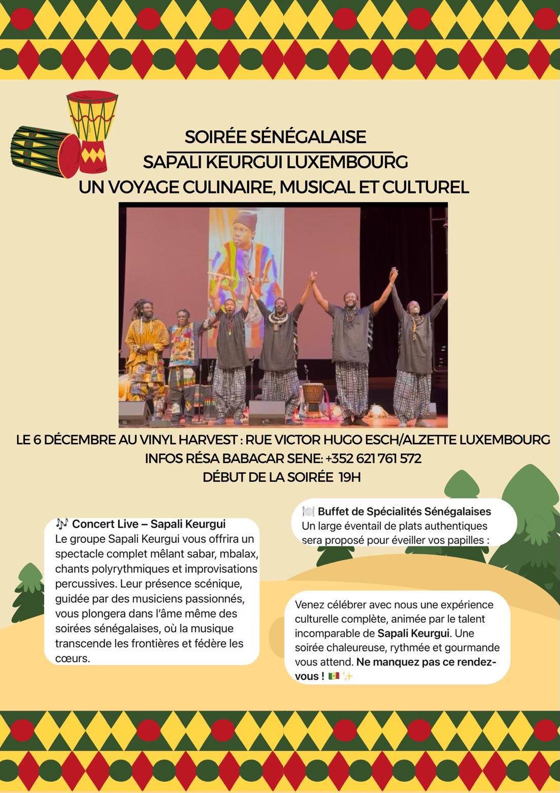 Nous vous invitons à une soirée exceptionnelle qui mettra à l’honneur la richesse et la chaleur de la culture sénégalaise. Préparez-vous à vivre un moment inoubliable, animé par le groupe Sapali Keurgui, reconnu pour son énergie vibrante, ses percussions puissantes et sa capacité à rassembler les publics autour de rythmes traditionnels et modernes.